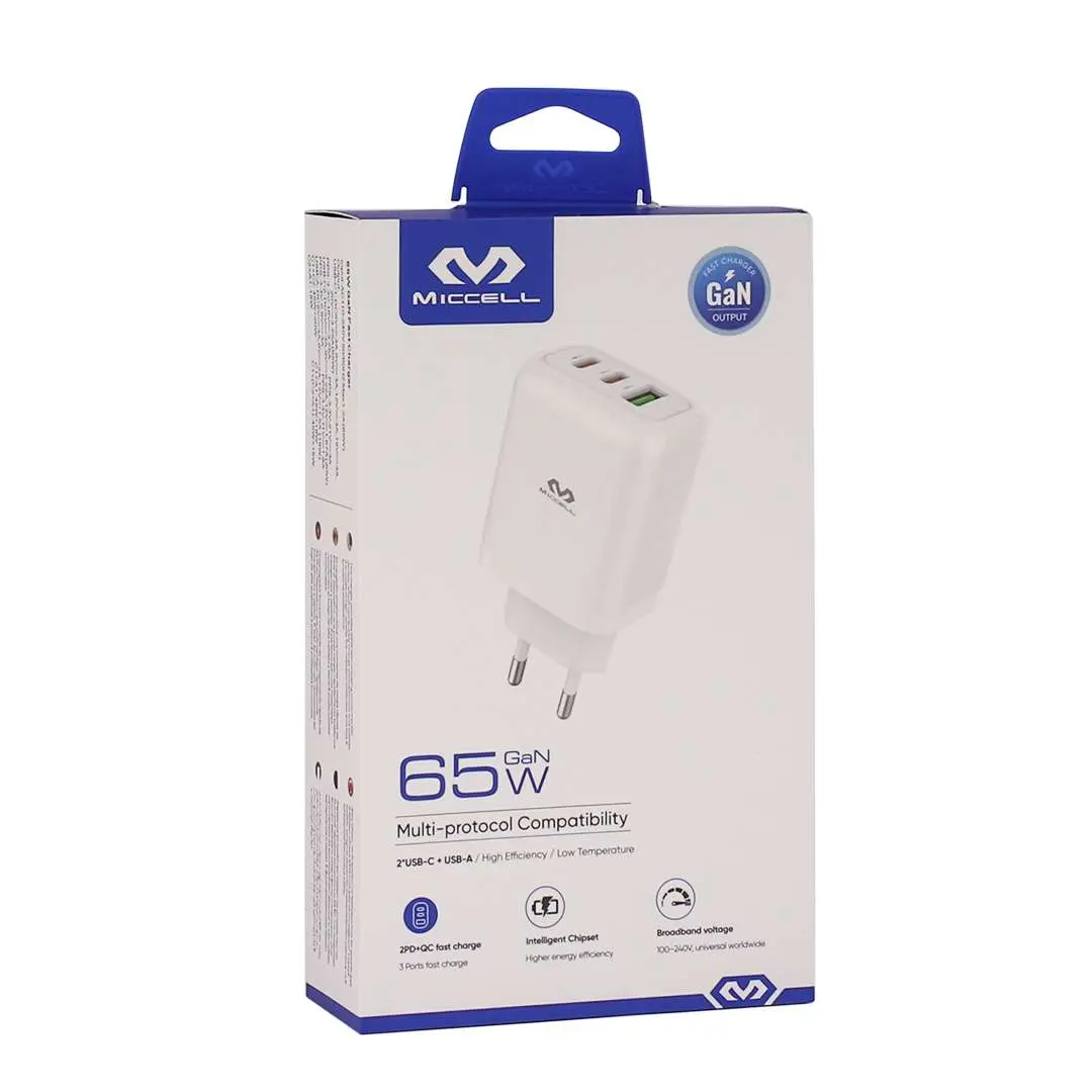 Cargador de alta potencia pensado para una carga rápida y eficiente de múltiples dispositivos. Cuenta con dos puertos USB-C y un puerto USB adicional, lo que permite cargar hasta tres equipos al mismo tiempo. Su potencia de 65W lo hace ideal para celulares, tablets y otros dispositivos compatibles que requieren mayor energía. Es una opción práctica tanto para el hogar como para la oficina, reduciendo la cantidad de cargadores necesarios.